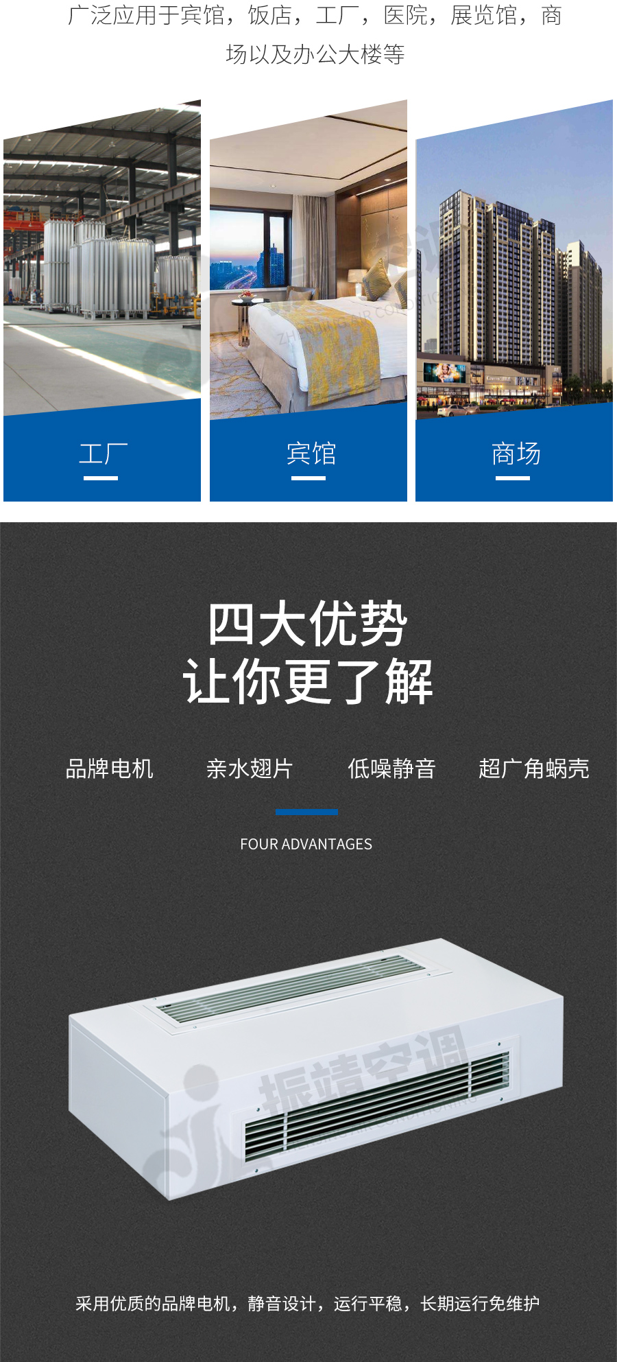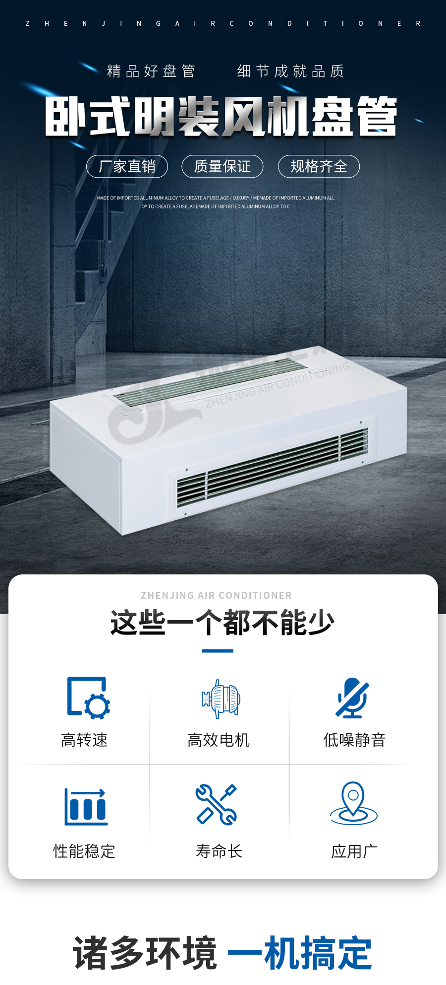 臥式明裝風機盤管主要由風機、熱交換器(盤管)、凝水盤、殼體及控制器組成,它適用于集中式空調系統。設計先進、品種齊全、性能優越,用途廣泛,通常用于要求噪聲小,溫度調節靈活的各種賓館、公寓、飯店、醫院、商業大樓等。
